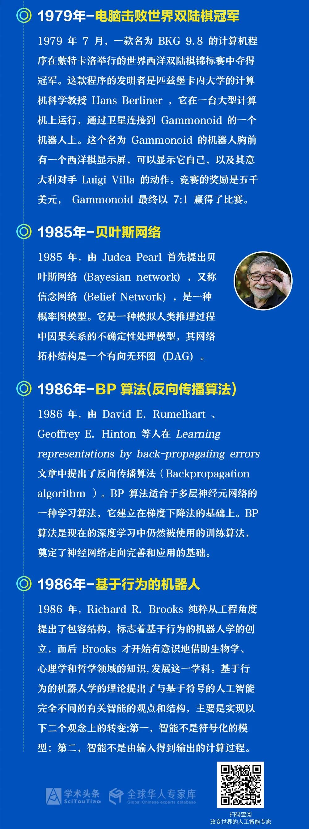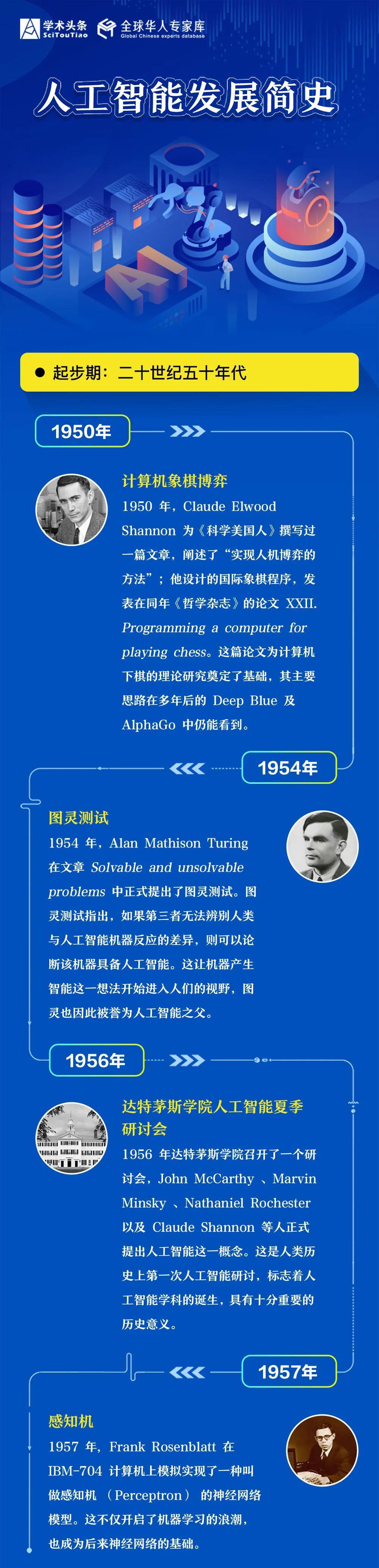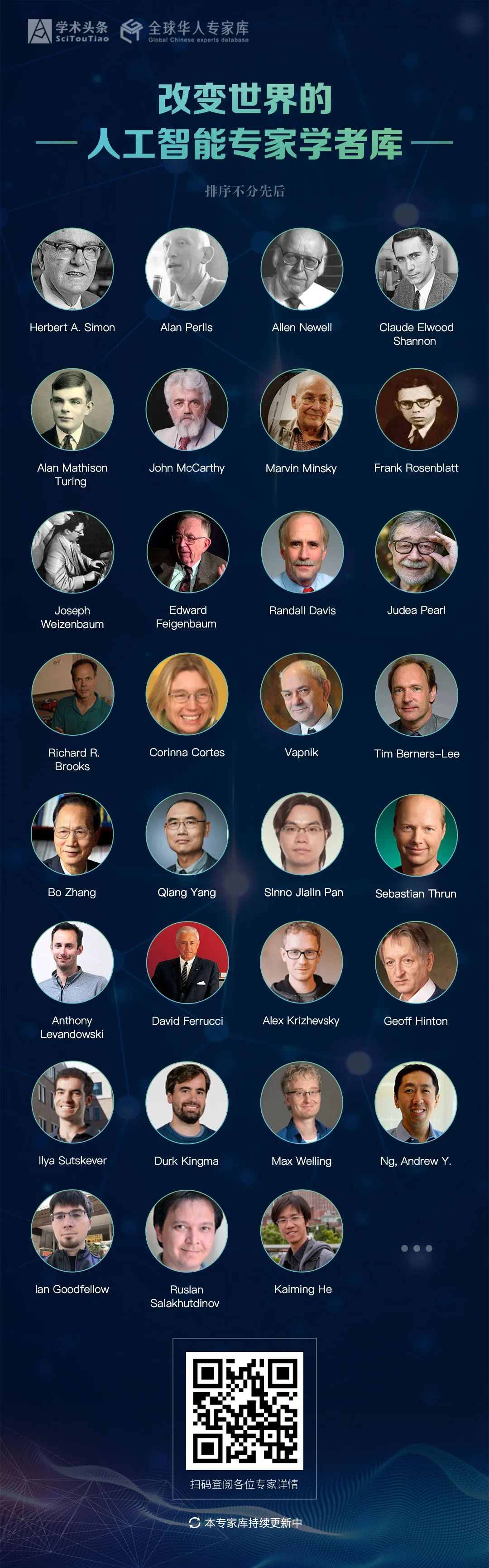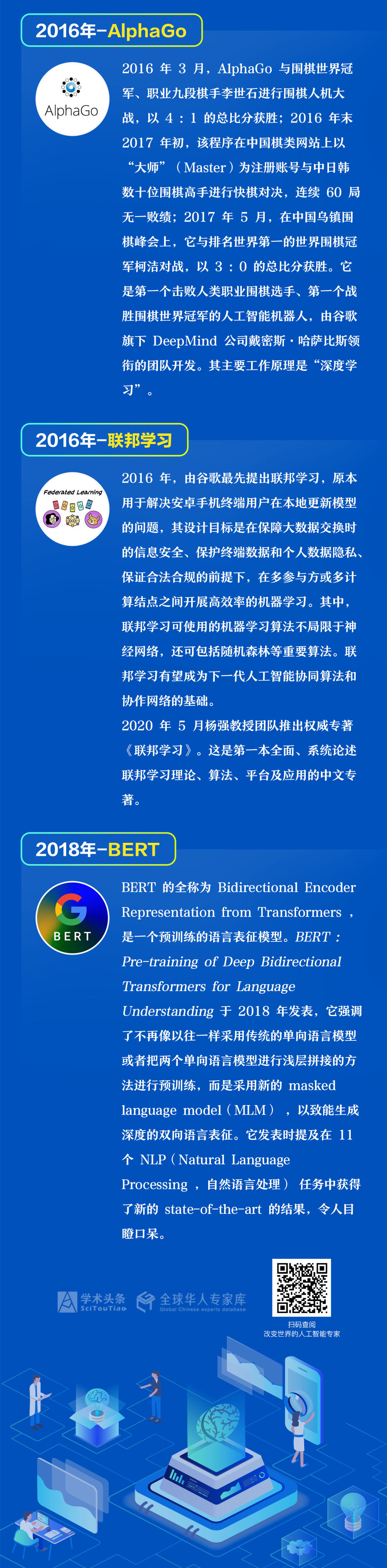 人工智能将融入每个人的生活,变得无处不在。虽然任何技术的发展都会有高峰和低谷,在漫漫人工智能发展长河中,应保持乐观也保留理智。我们相信未来人工智能必将发挥长处,造福人类生活,促进经济发展。 最后,学术头条向那些致力于人工智能发展的一代又一代创新者们致敬。科技发展的背后离不开推动创新的人们,我们也期待更多年轻人,投身到科技改变世界的浪潮中。 参考文献: 1. Jie Tang, Jing Zhang, Limin Yao, Juanzi Li, Li Zhang, and Zhong Su. ArnetMiner: Extraction and Mining of Academic Social Networks. (https://www.aminer.cn/pub/53e9a5afb7602d9702edacce/arnetminer-extraction-and-mining-of-academic-social-networks) In Proceedings of the Fourteenth ACM SIGKDD International Conference on Knowledge Discovery and Data Mining (SIGKDD'2008). pp.990-998.2. C. E. Shannon, "XXII. Programming a computer for playing chess," Philosophical magazine, vol. 41, no. 314, pp. 256–275, 1950.3. AM Turing. Solvable and Unsolvable Problems[J]. B.j.copeland, 1955, 31.4. Minsky M . A Framwork for Representing Knowledge[J]. The Psychology of computer vision, 1975.5. Weizenbaum, Joseph. ELIZA—A Computer Program For the Study of Natural Language Communication Between Man And Machine[J]. Communications of the Acm, 1983, 9(1):36-45.6. Kingma D P , Welling M . Auto-Encoding Variational Bayes[J]. 2014.7. Devlin J , Chang M W , Lee K , et al. BERT: Pre-training of Deep Bidirectional Transformers for Language Understanding[J]. 2018.8. Haenlein M, Kaplan A. A brief history of artificial intelligence: On the past, present, and future of artificial intelligence[J]. California management review, 2019, 61(4): 5-14.9. 史忠植. 高级人工智能[M]. 科学出版社, 2011.10. 顾险峰. 人工智能的历史回顾和发展现状[J]. 自然杂志, 2016, 38(003):157-166.11. 尼克. 《人工智能简史》[J]. 科普创作, 2018.12. 陈宗周. 《AI传奇-人工智能通俗史》[J]. 科普创作, 2018.13. https://www.aminer.cn/ai-history14. https://tech.sina.com.cn/roll/2020-07-16/doc-iivhvpwx5735932.shtml15. http://www.samr.gov.cn/samrgkml/nsjg/bzjss/202008/t20200805_320544.html16. https://en.wikipedia.org/wiki/Artificial_intelligence17. https://en.wikipedia.org/wiki/History_of_artificial_intelligence18. http://sitn.hms.harvard.edu/flash/2017/history-artificial-intelligence/19.https://www.livescience.com/47544-history-of-ai-artificial-intelligence-infographic.html(https://www.livescience.com/47544-history-of-a-i-artificial-intelligence-infographic.html)20. http://courses.cs.washington.edu/courses/csep590/06au/projects/history-ai.pdf21. https://www.aaai.org/ojs/index.php/aimagazine/article/view/1904/180222.https://www.technologyreview.com/s/602830/the-future-of-artificial-intelligence-and-cybernetics/23.http://www.bbc.com/future/story/20170307-the-ethical-challenge-facing-artificial-intelligence24.https://qz.com/1307091/the-inside-story-of-how-ai-got-good-enough-to-dominate-silicon-valley/25. https://zh.wikipedia.org/wiki/AlexNet#cite_note-quartz-126. http://www.dpkingma.com/27. https://en.wikipedia.org/wiki/Autoencoder28. https://en.wikipedia.org/wiki/Generative_adversarial_network29. https://en.wikipedia.org/wiki/Ian_Goodfellow30. https://poloclub.github.io/ganlab/31.https://www.technologyreview.com/2018/02/21/145289/the-ganfather-the-man-whos-given-machines-the-gift-of-imagination/32. https://www.jianshu.com/p/efda7876fe1c33. http://blog.itpub.net/29829936/viewspace-2217861/34. http://www.techwalker.com/2017/1225/3102138.shtml35. https://zhuanlan.zhihu.com/p/2035074336. https://blog.csdn.net/cao812755156/java/article/details/8959841037. https://blog.csdn.net/weixin_43624538/article/details/8504969938. http://kaiminghe.com/39.https://www.jiqizhixin.com/graph/technologies/1c91194a-1732-4fb3-90c9-e0135c69027e40. https://www.openai.com/41.Shortliffe EH, and Buchanan BG (1975). "A model of inexact reasoning in medicine". Mathematical Biosciences. 23 (3–4): 351–379. doi:10.1016/0025-5564(75)90047-4. 本文根据文献资料整理而成,时间仓促难免有误,如您有任何建议,欢迎联系:aiopen@aminer.cn。感谢您的关注与支持。 总策划:毛潇 文字编辑:赵雅琦、刘艺馨 图片编辑:刘静 排版:赵辰霞 编审:王新凯感谢所有对本文有贡献的专家技术顾问。 想要了解更多学术进展、前沿科技资讯,参与学术头条每日话题讨论,可以扫描二维码或搜索 AMiner308 添加学术君微信,对学术君说: “我想进读者群”, 即可进入读者群,不定期发福利~ 点击阅读原文,查看更多精彩! 喜欢本篇内容,请分享、点赞、在看