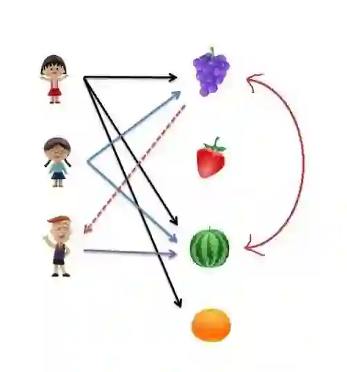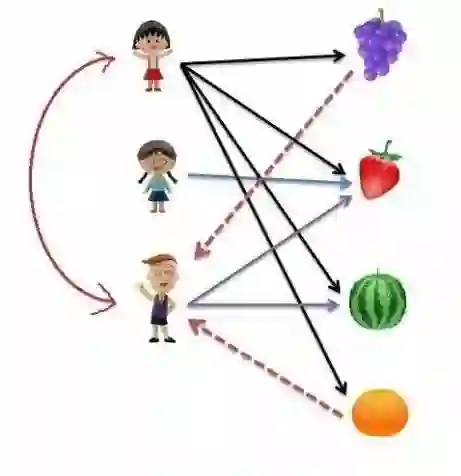 基于物品的协同过滤算法给用户推荐那些和他们之前喜欢的物品相似的物品。比如,我们知道樱桃小丸子和小玉都喜欢葡萄和西瓜,那么我们就认为葡萄和西瓜有较高的相似度,在花伦选择了西瓜的情况下,我们会把葡萄推荐给花伦。