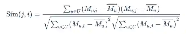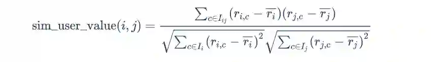 在基于用户相似度的协同过滤中,用户相似度的计算是基本前提。Pearson相关系数主要用于度量两个变量 i 和 j 之间的相关性,取值范围是+1(强正相关)到-1(强负相关),计算公式为: