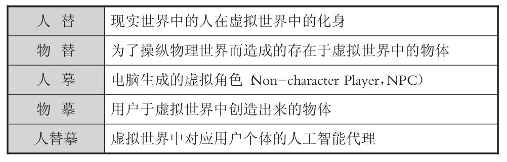 国内中山大学哲学系教授翟振明是较早提出扩展现实概念的学者,他认为从技术综合性和广度来讲,扩展现实是将互联网、物联网和混合现实技术结合起来技术形式;从哲学角度讲,扩展现实将是创造人类未来“虚实融合”的新世界模式,尤其强调在拓展现实中人类的自由意志活动。如表3所示,在其著作《有无之间:虚拟实在的哲学探险》中,他着重阐释了虚拟现实中的“人替”、“物替”以及扩展现实中的“人摹”、“物摹”和“人替摹”[18]。其构想的未来扩展现实概念,与近年流行的数字孪生相接近。所谓数字孪生(Digital Twin)是一种集成多物理、多尺度、多学科属性,具有实时同步、忠实映射、高保真度的特性,能够实现物理世界与信息世界交互与融合的技术手段[19]。