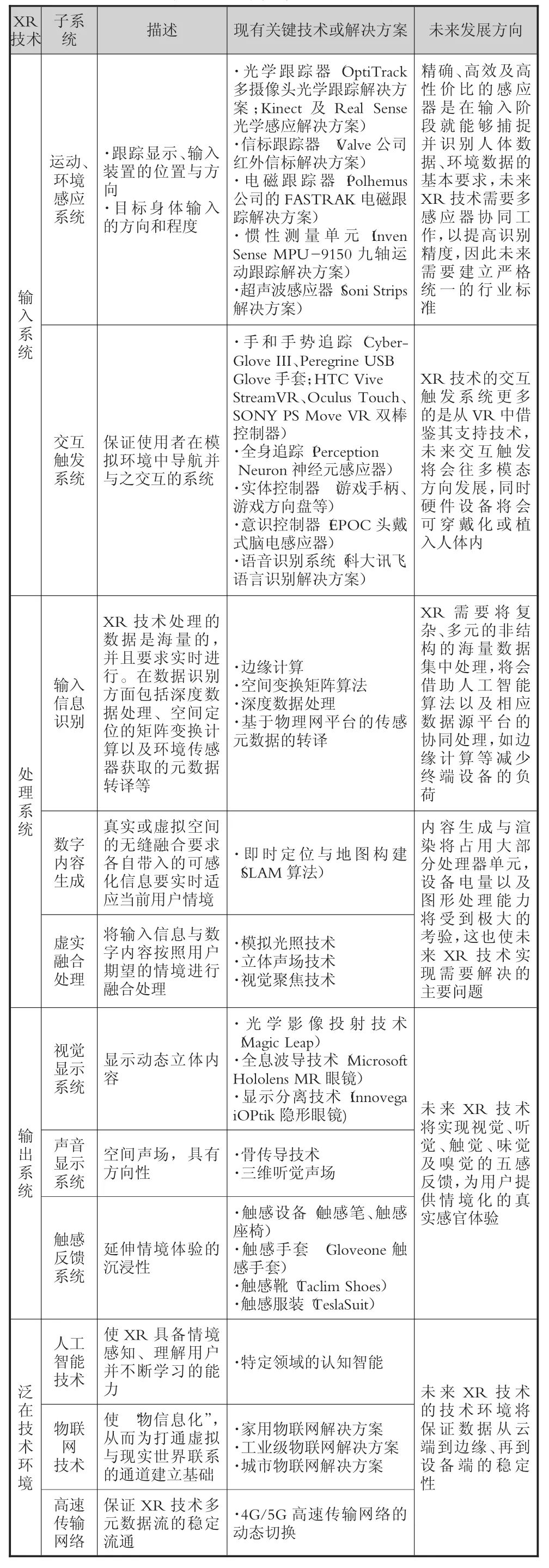 MR对于VR的发展,表现在能够将现实世界中的内容代入虚拟空间,实现虚拟环境的即时生成与构建,并保持与现实空间的协同,以提高用户体验的自由度。三者主要的技术区别如表2所示。微软公司的HoloLens,以及Magic Leap公司所研发的混合现实设备,能够代表现阶段增强现实、虚拟现实技术的融合情况。但其仍是以视觉为主要感知方式的显示设备,在体验方面仍有局限之处,这也为扩展现实技术的提出,奠定了基础。