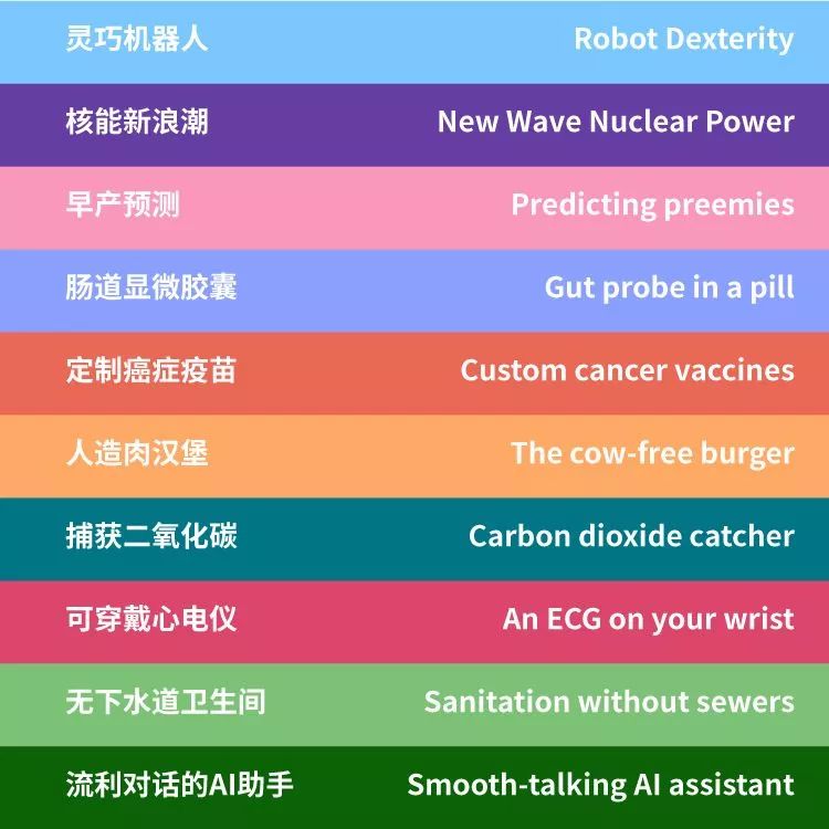 除了AI助手,今年MIT评选出的“十大突破性技术”还包括“肠道显微胶囊”、“定制癌症疫苗”、“人造肉汉堡”、“可穿戴心电仪”、“无下水道卫生间”等。