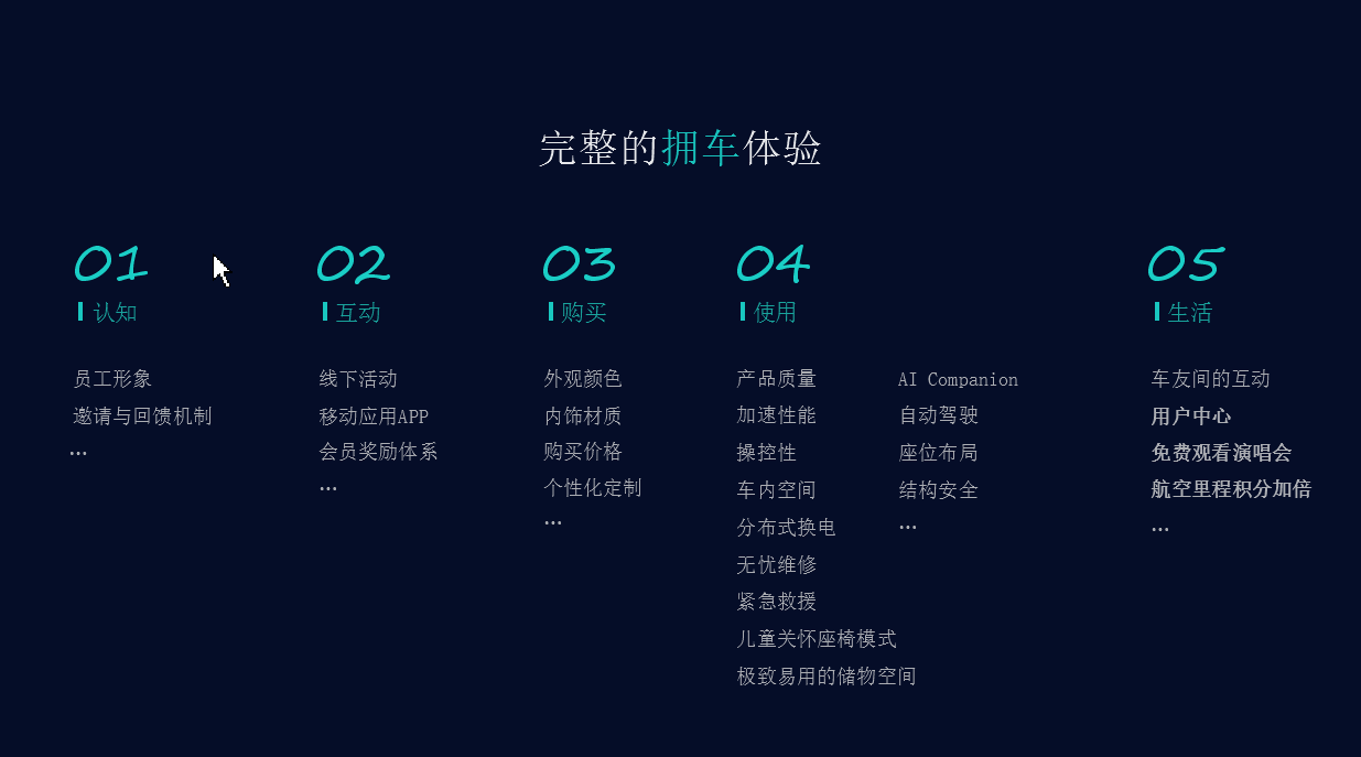 我们将汽车的用户体验分成四大方面,大体上就是我们对用户变革方向的一个思考。