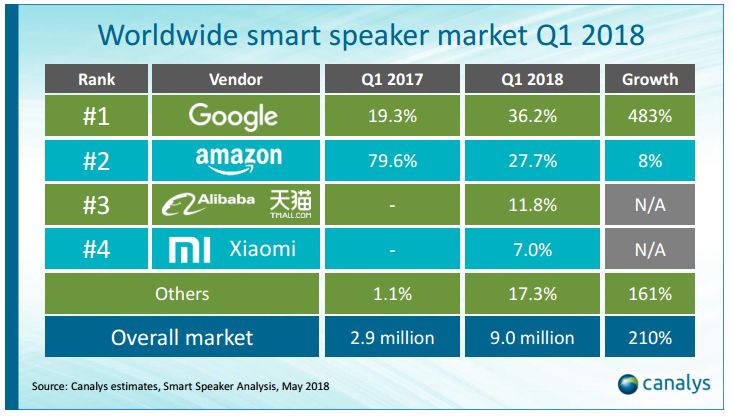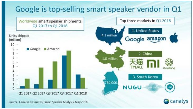 基于人工智能技术的智能音箱在全球风靡一时,许多厂商纷纷开始模仿亚马逊的这一重大创新。据外媒最新消息,一家市场研究公司的最新报告显示,一季度在全球智能音箱市场,谷歌超过亚马逊夺得冠军,中国两家厂商进入了前四名。