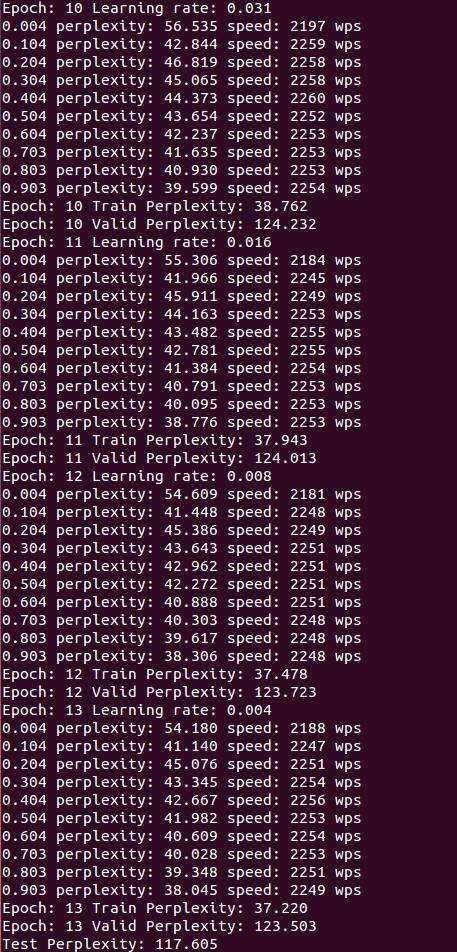 这里简便的放入了最后结果,我们可见,在13个epoch时,我们的测试perplexity为117.605, 对应了论文里non-regularized LSTM的114.5,运行时间约5到6小时。