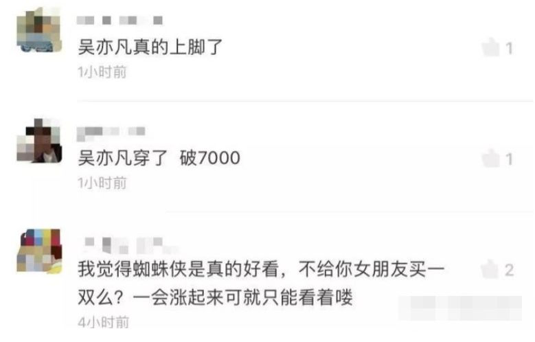 吴亦凡上脚了AJ1蜘蛛侠后,该款鞋子短短一小时内价格上涨了5倍左右。