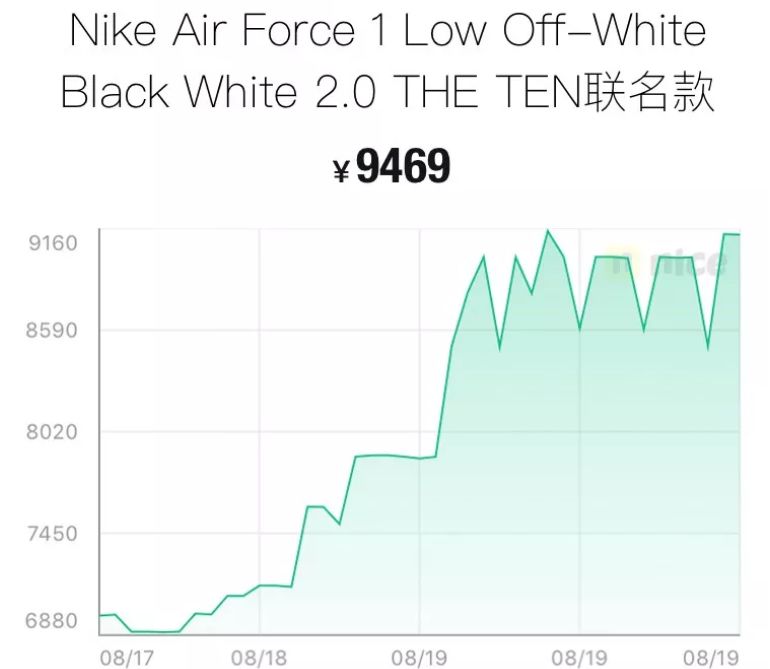 举个例子,AJ1 x OW芝加哥,从8000涨到1万,再到2万,还没封顶,现在已经炒到5万,黄金码甚至7万,简直比炒股还刺激。