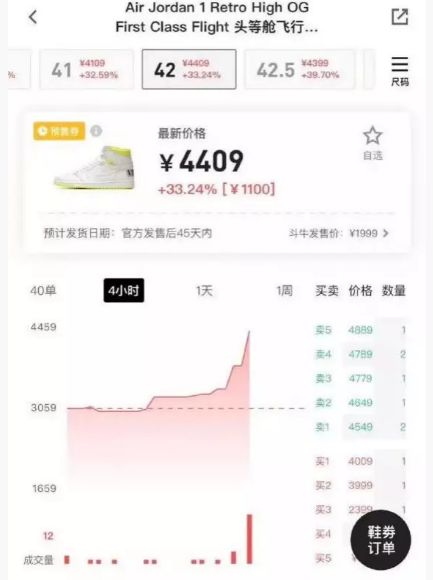 在分时图上,一双鞋的价格在短短几个小时内飙涨近50%,并且成交量急速放大。