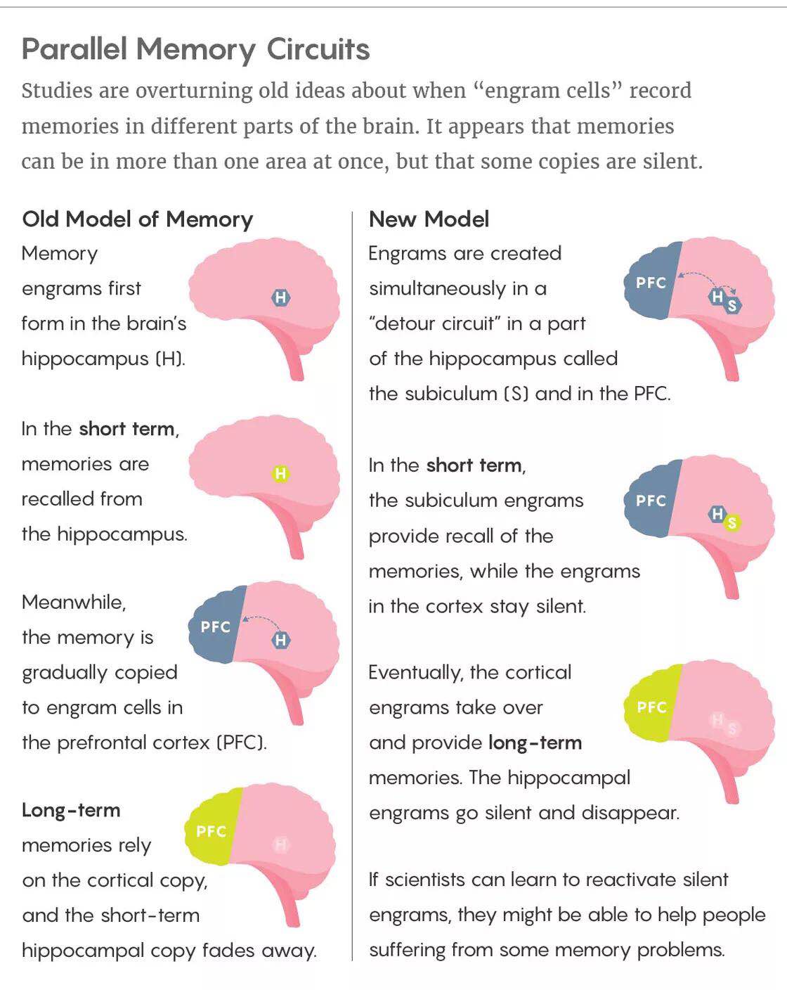 在过去的几十年中,神经科学领域最为广泛接受的记忆模型,是首先立刻在海马区形成短期记忆,然后转移到前额叶皮层进行长期存储。但是利根川进的团队最近在《科学》上报道,新的记忆会在这两个脑区同时形成。