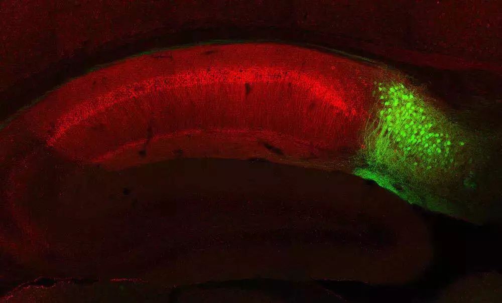 研究发现,海马神经元(红色)对新记忆的形成是必要的,但负责回想记忆的是海马下托部分的神经元(绿色)。来源:Dheeraj Roy/Tonegawa Lab, MIT