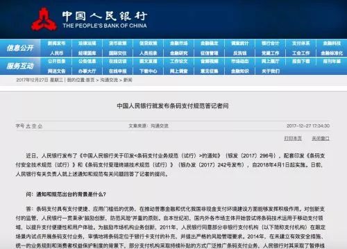谈及此次出台上述文件的原因时,央行方面表示,条码支付具有支付便捷、应用门槛低的优势,在推动普惠金融和优化我国非现金支付环境建设方面能够发挥积极作用。