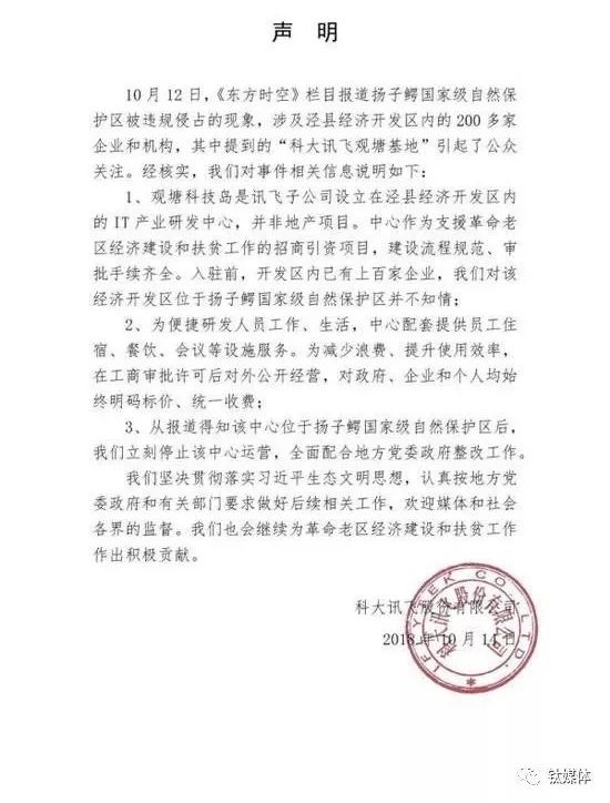 针对此事,科大讯飞回应称,对该经济开发区位于扬子鳄国家级自然保护区并不知情。观塘科技岛是讯飞子公司设立在泾县经济开发区内的IT产业研发中心,并非地产项目。中心作为支援革命老区经济建设和扶贫工作的招商引资项目。入驻前,开发区内已有上百家企业。目前已经停运接受整改。