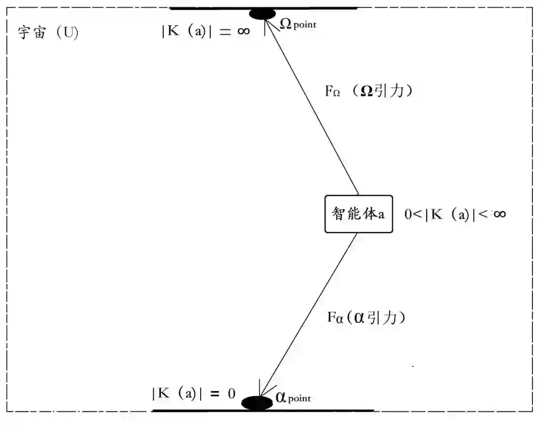 任何一个智能体都会受Ω引力或α引力的影响,向四种能力为无穷大的全知全能智能体(Ω点)或为0的绝对0智能体(α点)演化