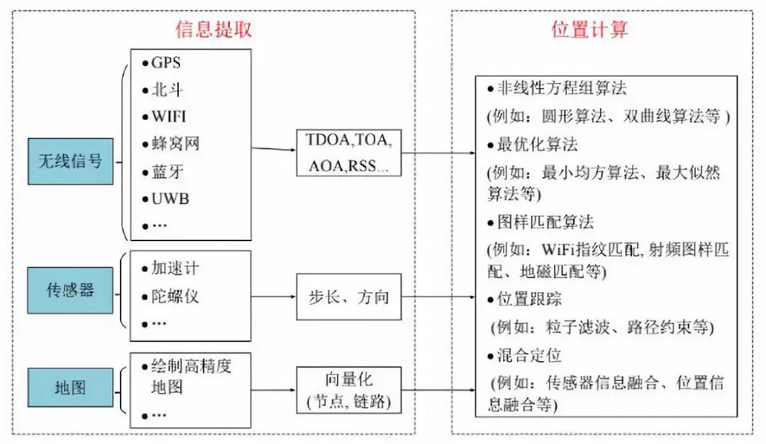 信息提取:可用于定位的对象包括无线信号(例如GPS、北斗、WiFi、蜂窝网等)、传感器(例如加速器、陀螺仪等)以及地图信息等,而不同的对象提取出的定位信息参数也各不相同。对于无线信号,收发机之间距离信息需要通过估计两者无线信道链路的参数信息来获取,该参数包括接收信号强度(Received Signal Strength,RSS)、到达时间(Time of Arrival,TOA)、到达时间差(Time Difference of Arrival,TDOA)、到达角(Angle of Arrival,AOA)等。实际接收的无线信号受非视距传输及多径效应、阴影效应的影响,因而即使精确估计信道参数信息,也难以获取准确的收发机之间的直线距离。传感器获得的是定位目标的运动方向、步长等信息。地图信息通常通过绘制高精地图,获得向量化参数,用来对定位目标进行约束或优化。上述参数是进行下一步位置估计的前提。