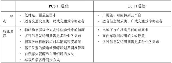 同时C-V2X根据接口的不同又可分为V2X-Direct和V2X-Cellular两种通信方式。V2X-Direct通过PC5接口,采用车联网专用频段,实现车车、车路、车人之间直接通信,时延较低,支持的移动速度较高,但需要有良好的资源配置及拥塞控制算法。V2X-Cellular则通过蜂窝网络U u接口转发,采用蜂窝网频段(如1.8GHz)。具体的PC5口和U u口对比如表所示。
