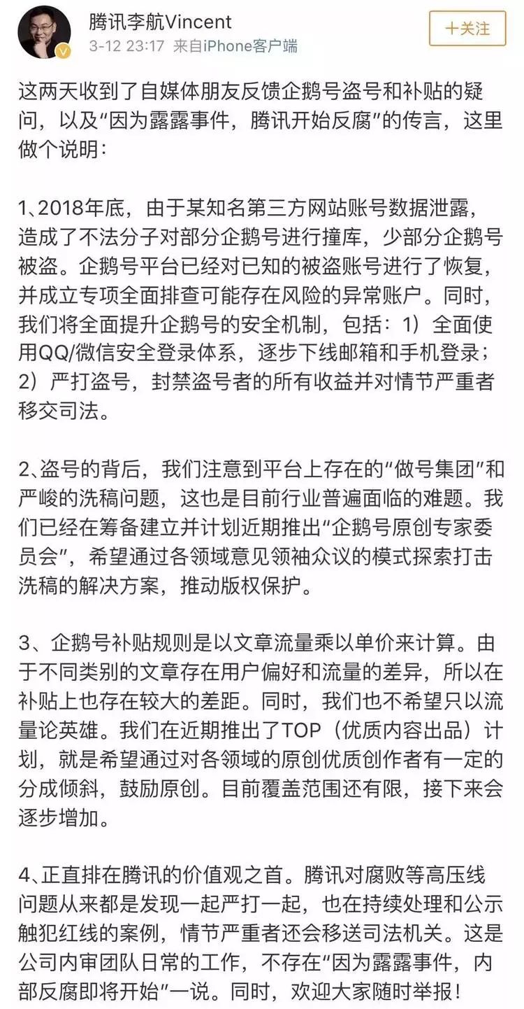昨晚23:17分,腾讯李航在微博回应“露露事件”: