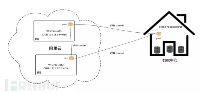 2、对于企业和云网络互通需求,由运行在本地数据中心的VPN容器向运行在云网络的VPN容器发起IPSec连接,这样设计是为了避免对企业网络进行改动,减少对硬件设备的依赖,适应主流的互联网接入方式。