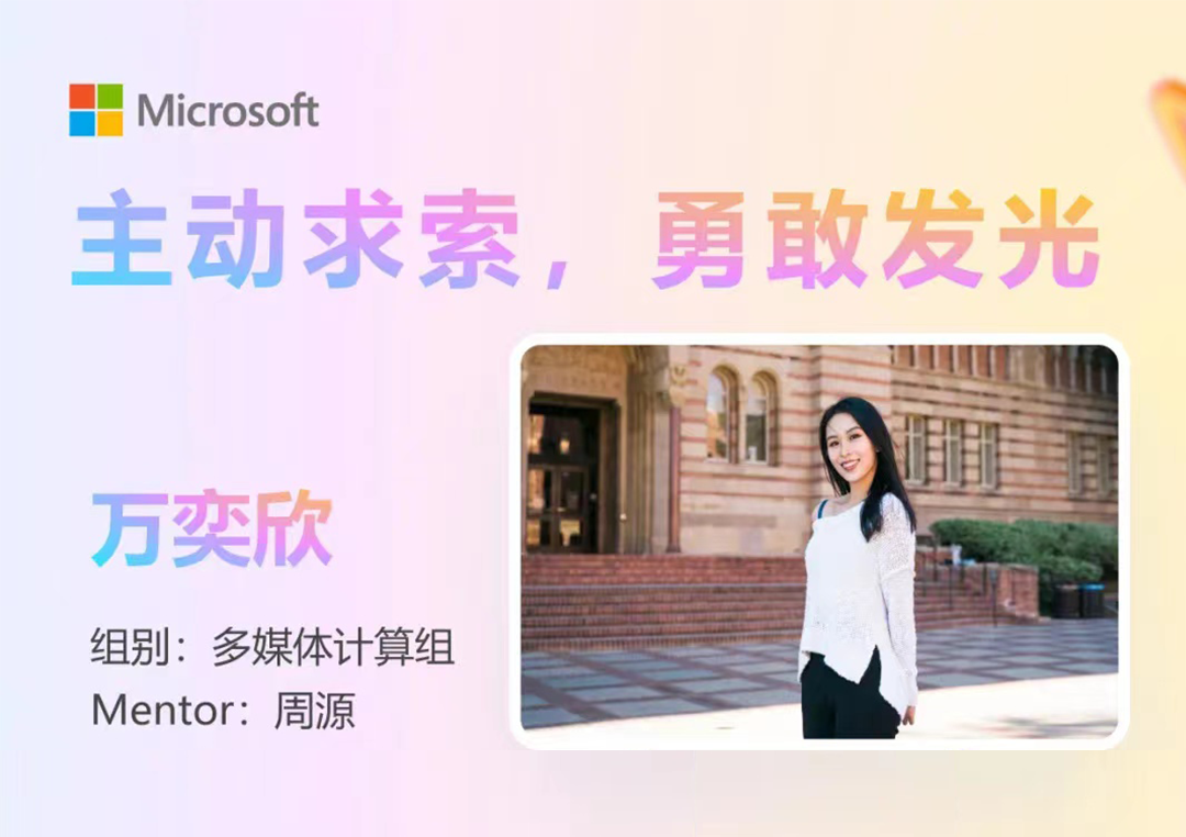 2022年5月,来自加州大学洛杉矶分校的奕欣来到微软亚洲研究院实习,实习期间她努力完成工作、积极参加各种活动,在研究院里绽放着自己的的光芒。