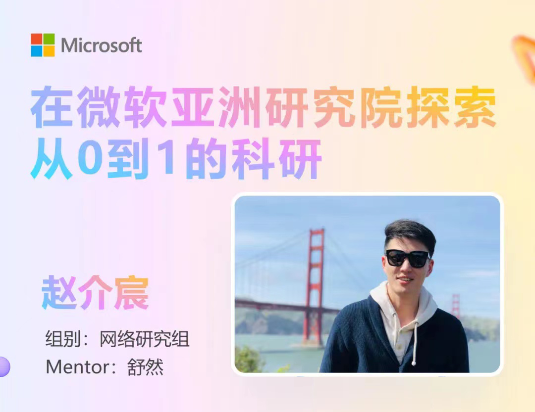 除了mentor给予的支持之外,介宸还经常主动在研究院寻找学习的机会。研究院每周举办的“Intern Tech Talk” 他也积极参与,即使分享的内容不是自己的研究领域,他也乐于接触不一样的科研视角。一年的时间,介宸在微软亚洲研究院不断打磨专业技能,积累科研经验。与微软亚洲研究院的其他实习生一样,作为新生力量,他们借助研究院的平台不断向上生长,厚积薄发。