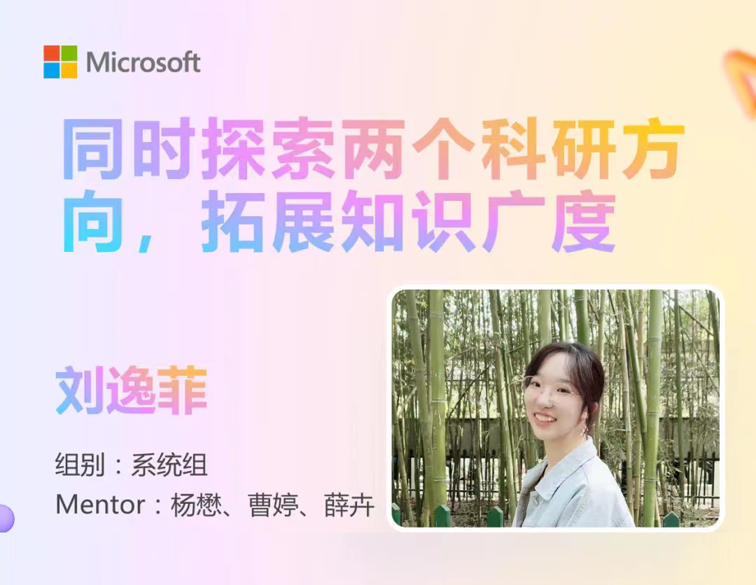2021年7月入选中国科学技术大学-微软亚洲研究院联合培养博士生项目的刘逸菲,在微软亚洲研究院度过了充实又难忘的一年——同时探索两个科研方向,极具挑战也收获颇丰。逸菲的mentor、微软亚洲研究院副院长杨懋认为,大四阶段应该着重拓宽知识广度,在研究生阶段再追求深度。考虑到逸菲的科研兴趣包括两个不同的方向,杨懋邀请了异构计算方向的曹婷和强化学习方向的薛卉这两位研究员来同时指导逸菲的科研工作。同时进行两个方向的科研探索,让刚开始着手做科研的逸菲颇感压力,也因此出现了精力不集中、效率不高等情况。经过mentor们的悉心指导,以及逸菲自己的适应和摸索,她逐渐进入状态,掌握了多任务处理的能力,也学会了梳理待办事宜、排列优先级,从而更合理地安排每天的工作时间。经过一年的探索,逸菲对自己感兴趣的两大方向逐渐入门。她在曹婷的指导下完成了为Office的语法检查模型做剪枝的工程项目,根据实践的启发,针对剪枝算法与稀疏计算实现相割裂的问题,提出了算法和系统实现协同设计的创新方法,从而使模型精度和运行性能都达到最优,该工作论文正在撰写当中。同时,她也在薛卉的指导下探索了以强化学习的复现为主的相关问题。