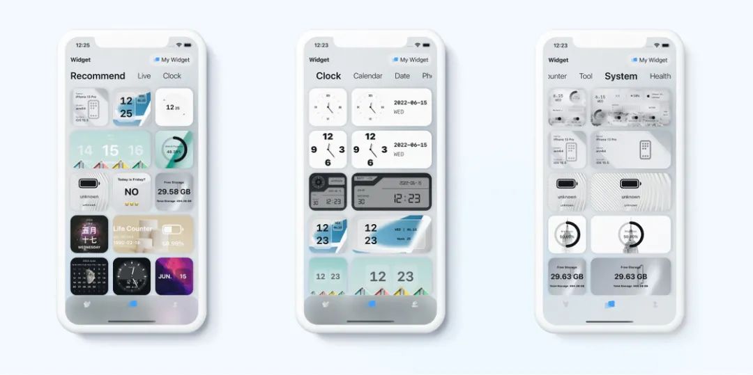 OneWidget 最早版本的小组件发现页,单屏幕展示的小组件并不多,对于一些不需要文字备注的小组件来说是一种空间的浪费。这一次,我们更新了小组件的发现页,在推荐页面尽可能展示了当下比较热门的小组件。