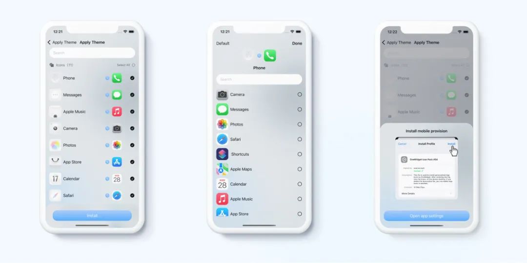 OneWidget 所采用的方式是通过描述文件来「批量安装应用图标」。这种方式可以让 OneWidget 通过服务器帮用户快速生成他们所需要的图标合集,然后一次性打包安装到手机桌面。安装之后,可以在桌面单个删除和移动,如果删掉描述文件,还可以将整个应用图标库全部移除。