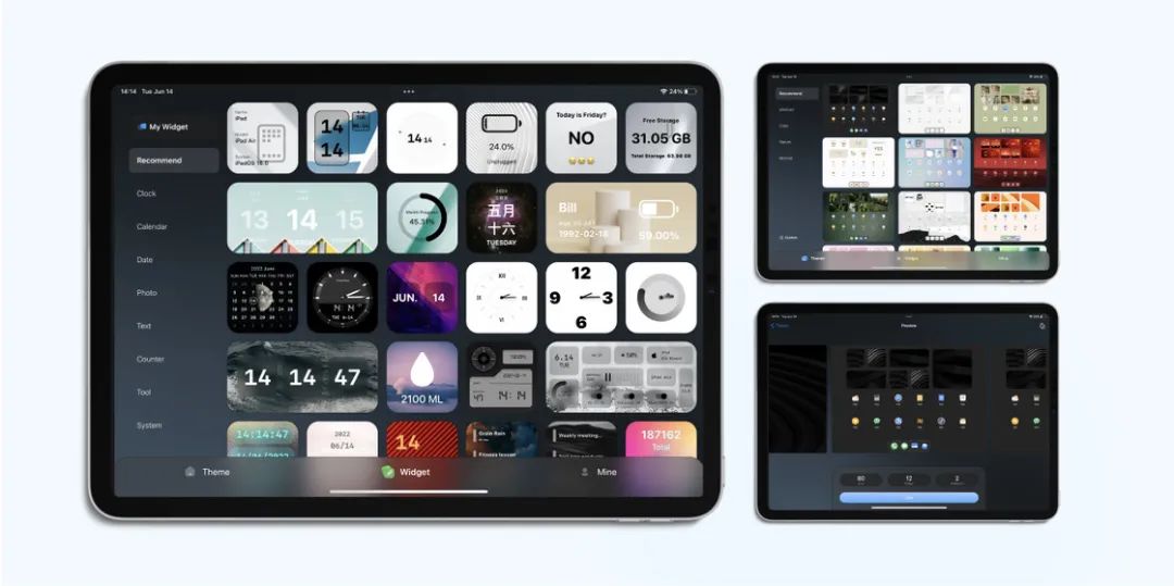 以前 iPad 版本上的主题都是直接沿用 iPhone 上的样式,现在,iPad 上所展示的主题都是经过单独设计的了,在 OneWidget 的 iPad 版本上,从封面图到预览图都适应了 iPad 尺寸的风格,我们还带来了 iPad 专属的超大尺寸小组件。