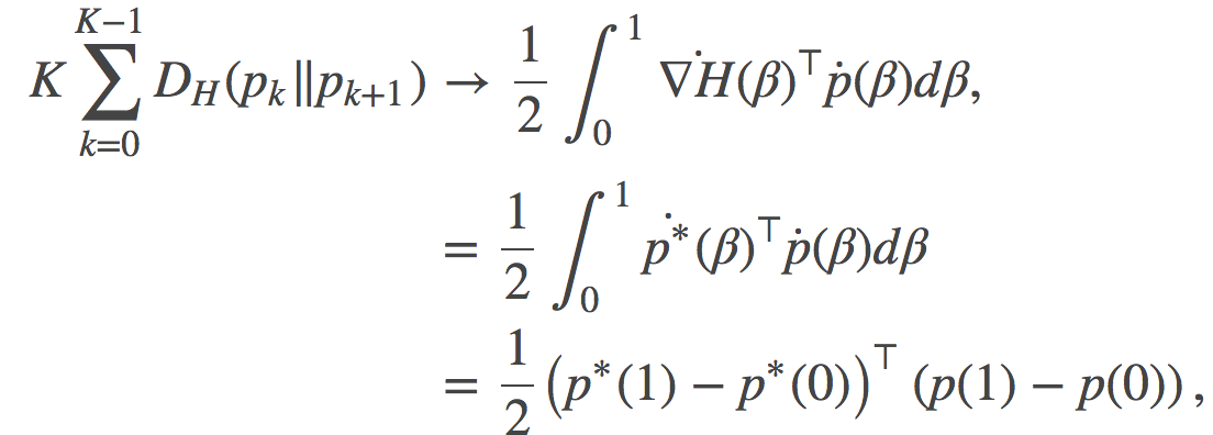 事实证明, 这个凸共轭是以时间 s参数的分布的Shannon的负熵(这已经超过了本帖所讨论的范围, 详情请参考this book chapter-http://onlinelibrary.wiley.com/doi/10.1002/9781118857281.ch9/summary)。