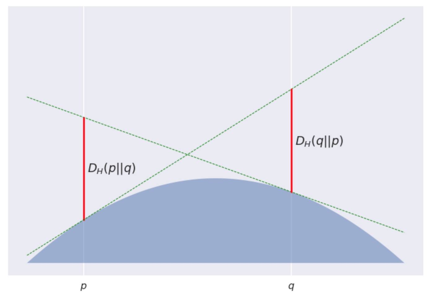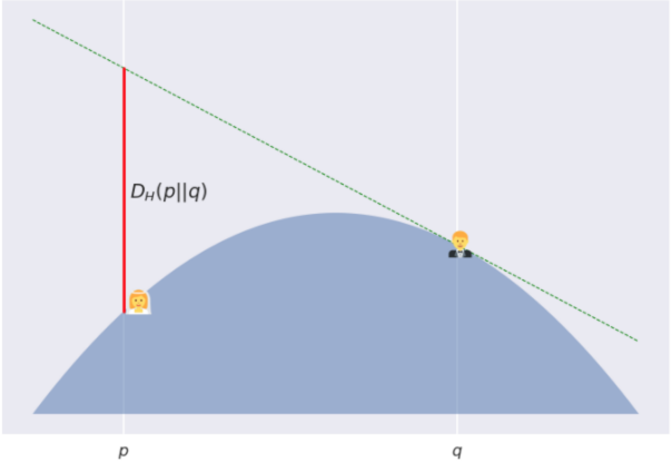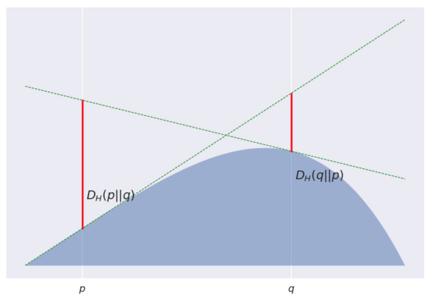 在这个图中, 我用了一个有点无聊的抛物线形的山丘, −H(p)=p(1−p)。由此产生的发散实际上是对称的, 并且其很简单的与平方欧几里得距离成比例: