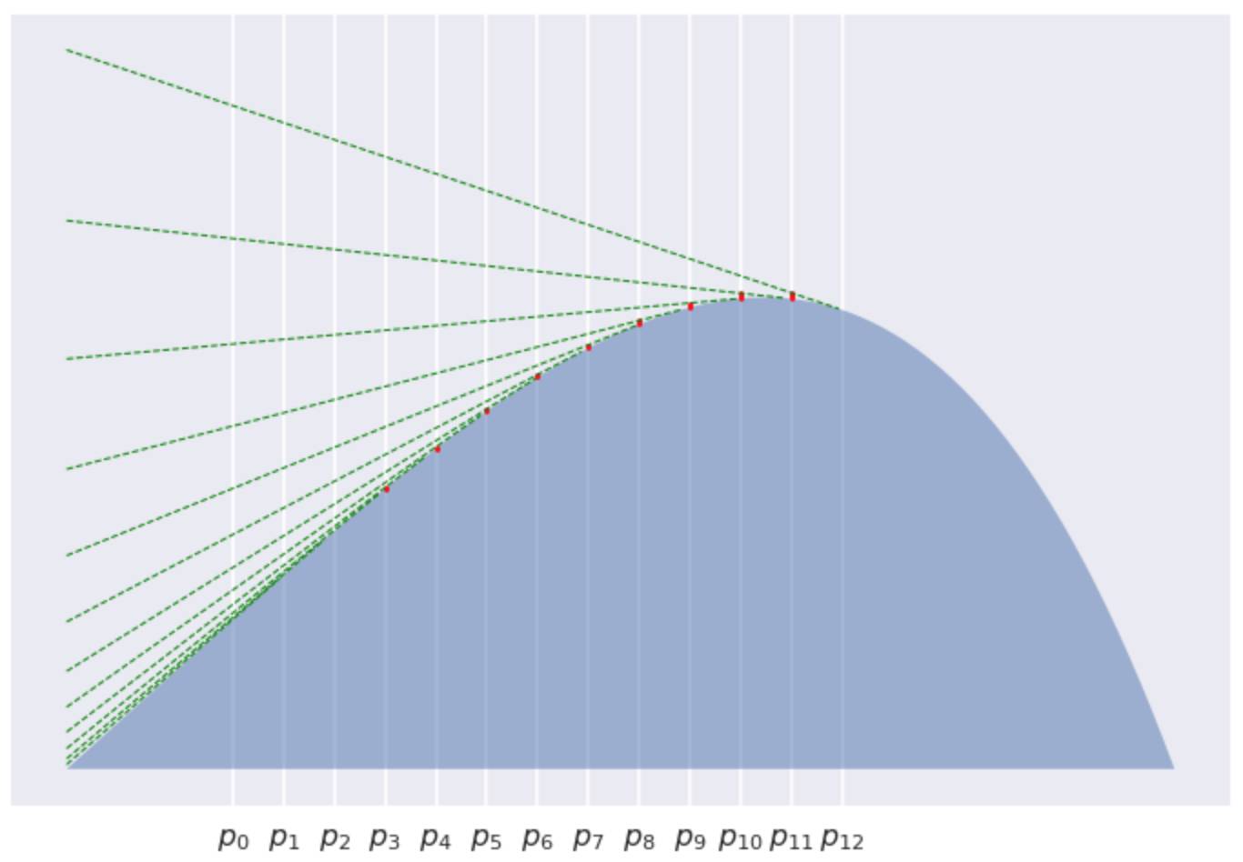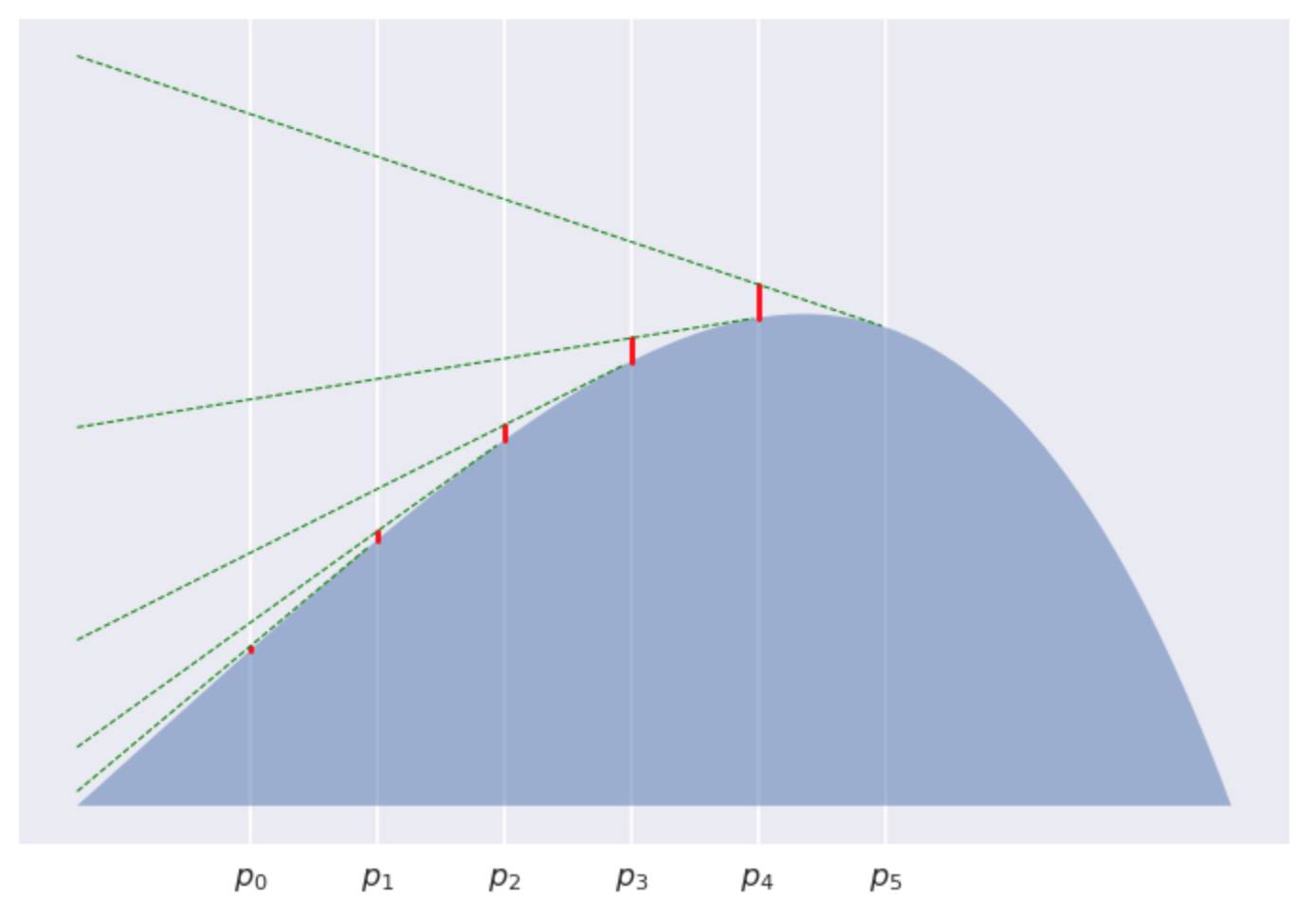 严格的说, 正是由于这个山丘是个凸函数, 所以 Quentin 并不能直接看到 Poppy, 除非她会跳! Bregman散度描述的就是 Quentin 跳起来后, Poppy 也不会看到她的最大安全距离。可见山丘越陡, 即曲率越大, Poppy 跳起来看不到 Quentin 的距离范围也就越大。