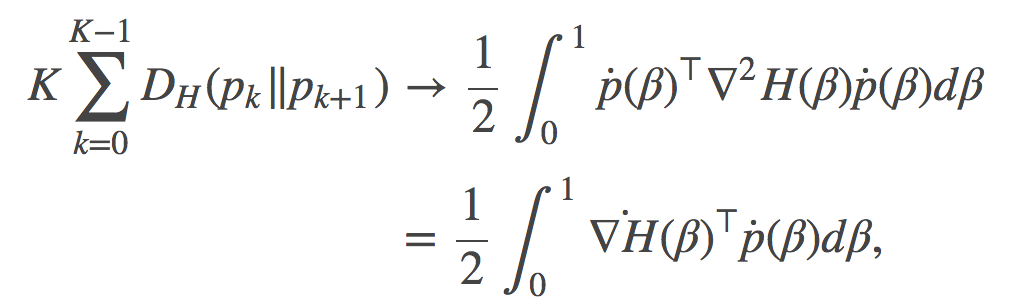 有意思的是, 如果在分布空间中沿着两条非常不同的路径计算F(γ)(自然参数空间中的一条直线或者时间空间中的一条直线), 你会得到完全相同的值。尽管这些路径明显的有着不同的分布, 正如文章中图1所描绘的。