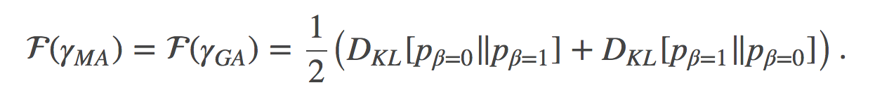 我们首先可以观察到的就是:公式 (18) 和 (19), 其不仅表明这两条路径是等价的, 而且还表明了损失 (cost) 可以用两终端之间的对称KL散度(有时也称为Jeffreys散度)来表示: