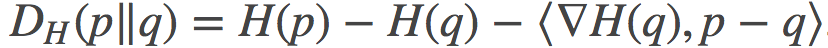 在凸域上的任何凸函数H都会有Bregman散度, 其在p和q两点之间的定义是: