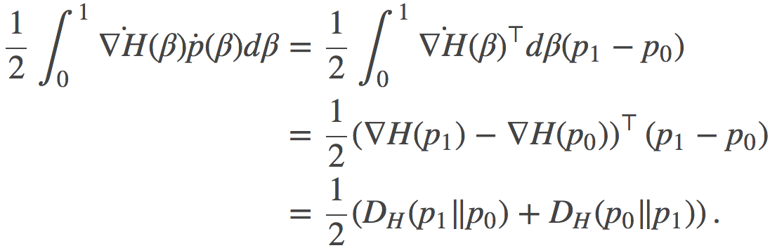 然后,为了对这个结果做推广,我将会用更加一般的Bregman散度族来替换KL散度,并且证明若沿着线性路径的无穷小散度做积分,总会在路径端点之间产生对称的散度出来。