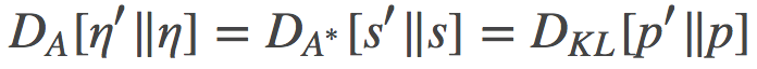 所以, 现在我们有两个 Bregman 散度, 一个是定义在η原始参数空间, 另一个定义在其s对偶空间上。两个散度是等价的, 而且在此情形下, 它们都等价于相应分布之间的KL散度: