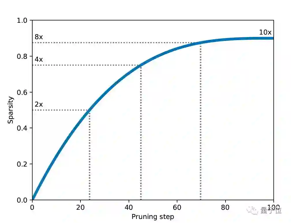 用户也可以根据需要调整这个上升函数。在某些情况下,可以安排训练过程在某个步骤达到一定收敛级别之后才开始优化,或者在训练总步数之前结束剪枝,以便在达到最终目标稀疏度时进一步微调系统。