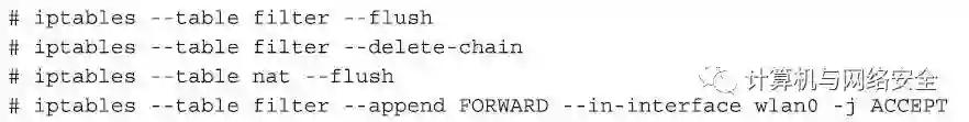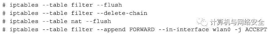 我们要做的第一件事就是清理我们的防火墙中现有的规则,以避免以前的配置项会对现在的修改有“后遗症”。下面的命令中,前三个命令把我们的防火墙恢复到正常启动状态,最后一个命令是确保任何来自wlan0的数据包,都必须通过防火墙。