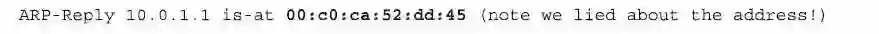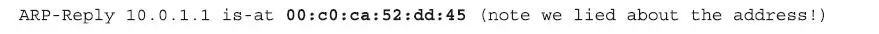 如果您的答案是“直接送到我们攻击过的那个Windows客户端上!”,那就自己表扬一下自己吧,恭喜你,答对了!这个“ARP-Reply 10.0.1.1 is-at 00:C0:CA:52:DD:45”的命令所对应的数据包送到那个Windows客户端上的原因是:我们只是修改了Windows客户端上的“ARP表”,而没有改变路由器上的“ARP表”。