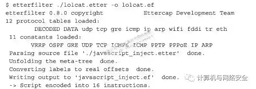 要让上面的源代码生效,被最终被Ettercap所实别,还需要通过Etterfilter程序对上面的代码进行编译。完成上面的操作,就可以用Etterfilter程序编译上面的这个过滤器了,其过程如下。