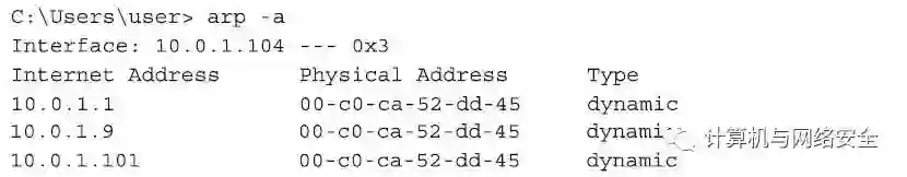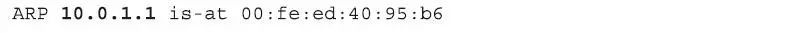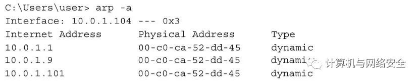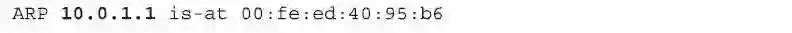上面数据包的意思很浅显,就是“10.0.1.1这台主机的MAC地址是“00:fe:ed:40:95:b6”。我们其实可以通过Windows笔记本电脑的角度来看这整个过程。在上面操作结束后等上一小会儿,我们就可以通过“arp–a”的命令来检查ARP表的最新状态,这时,您会看到一个非常小的ARP缓存。