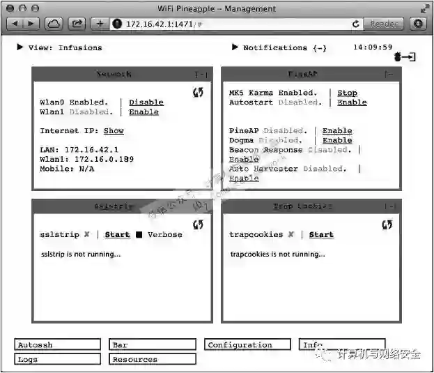 在“菠萝网吧”的“tile条”上,单击“菠萝网吧(Pineapple Bar)|可用(Available)”的链接,就可以安装sslstrip和trapcookies的“用户注入”(Infusion)功能。(这里的“用户注入”指的是攻击时所用的脚本,采用由“Wi-Fi小菠萝”提供的脚本。)下一步,关闭“菠萝网吧”的“tile条”,返回到主“tile条”列表上,这时,你会看到两个新的“tile条”窗口出现,整个界面类似于图5所示。
