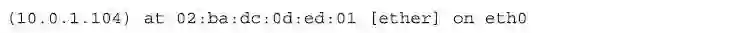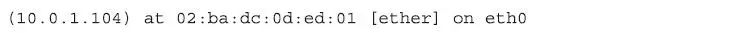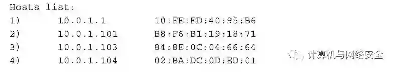 一旦Ettercap完成了对所有客户端主机的扫描工作,下面就会把所有的扫描结果告诉我们了。如前所述,子网地址是10.1.0.0,其中的10.1.0.104是我们自己。所以扫描器会告诉这个子网上的所有主机“10.1.0.104在扫描你们”,同样,扫描器也会告诉10.1.0.104“网上所有被扫描的主机都在下面列着”。当Ettercap完成扫描过程以后,Ettercap所在的10.1.0.104主机上,“ARP表”看起来如下所示: