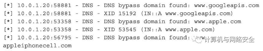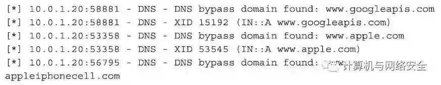 下面的命令可以将fakedns服务器配置成查询模式。对于每一个不在程序中标为“TARGETDOMAINS(目标域名)”列表中的查询,该服务器都可以返回正确的答案。