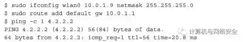 现在,作为该网络上一个正常的客户端,我们也得到了一个由使用DHCP授予客户端的客户租约(lease)。虽然这个操作方便,但这会在DHCP服务器的日志文件中留下一个访问记录,通过这个记录,网络的管理员就知道曾有黑客光临过。要避免这种情况发生,我们可以手工地设置我们的IP地址以及默认的路由,并且通过ping命令拿到一个公共的DNS服务器,然后通过这个DNS服务验证互联网上的连接可用性。