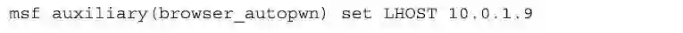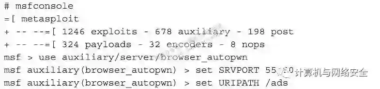 Metasploit工具包中的browser_autopwn程序是一个功能模块。该功能模块可以方便地检测许多种客户端的bug,这些漏洞根据它们的特点,以及相互间的历史传参关系,组成了一个“树”状的结构,并称为“Metasploit树”(Metasploit tree),凡是“Metasploit树”中的漏洞,browser_autopwn程序都可以检测到。首先,启动msfconsole程序,以便加载browser_autopwn模块。指定服务器的端口号(port number),注意要避免使用TCP方式下的80这个端口号,因为我们将在随后不同的攻击中使用该端口。一个无害的URL用于攻击时传送数据使用,设置这个URL需要通过参数“/ads”,如下所示。