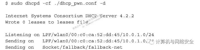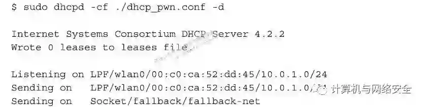 创建一个合适的配置文件,并保存为“./dhcp_pwn.conf”。操作完成后,打开一个新的终端,然后按如下的命令方式启动DHCP服务器: