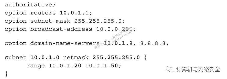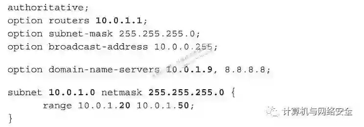 文件中,关键的值都以粗体显示。值得注意的是,当一个客户端通过DHCP服务器申请IP地址时,DHCP服务器可以同时将默认的路由IP地址和“域名解析服务”(DNS)服务器的地址一并给客户端。
