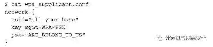 下一步,我们创建一个小的配置文件,该配置文件可以让wpa_supplicant程序运行连接到缺乏抵抗力的网络上。该配置文件在最小配置内容的情况下,如下所示。
